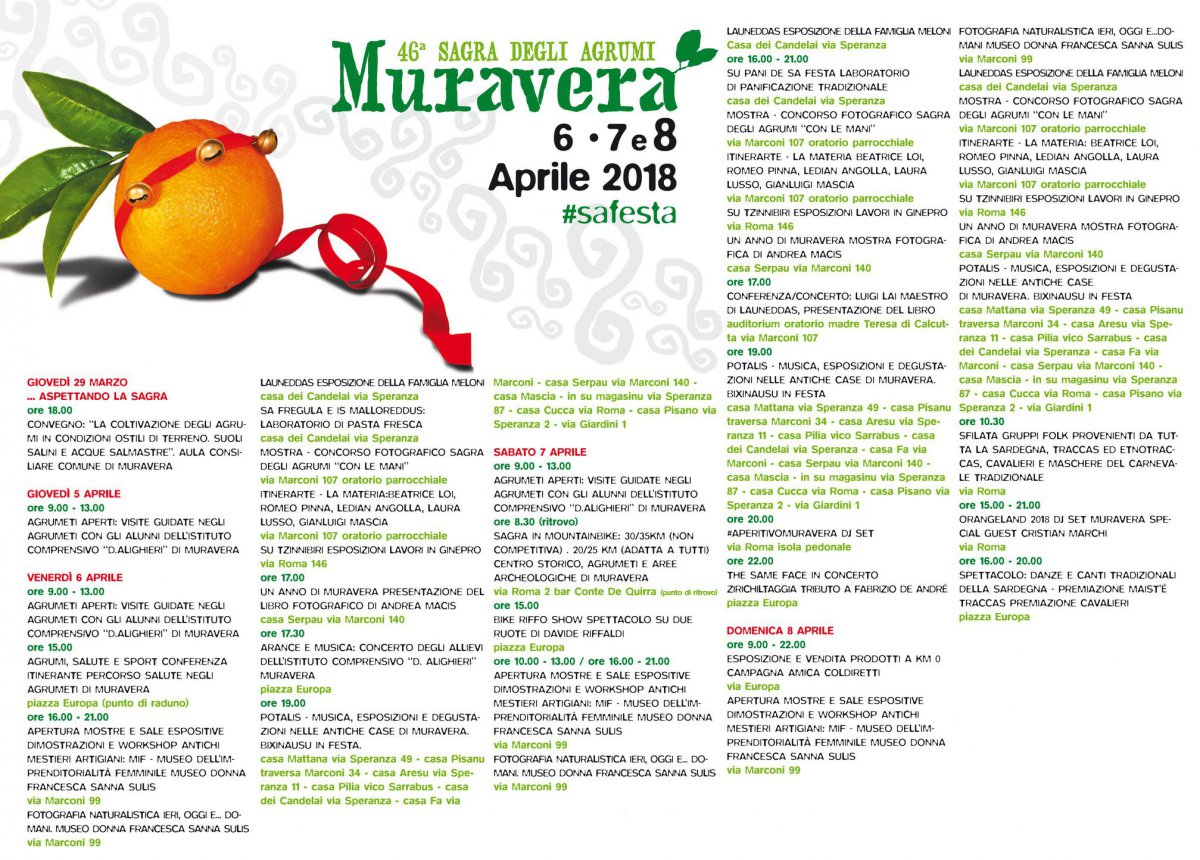 È la festa che segna la fine della stagione di raccolta degli agrumi, è "sa festa” per Muravera ed il suo comprensorio. E quest’anno l’8 aprile 2018 sarà il momento culminante della grande espressione di gioia per il centro di riferimento del Sarrabus, con la sfilata delle traccas per la 46ma edizione della "Sagra degli agrumi” di Muravera (Provincia di Cagliari). Ma il via sarà dato il precedente venerdì, per i tre giorni festa, che si snodano tra le cortes aperte delle case padronali, con le degustazioni di agrumi insieme ai prodotti locali. Non mancheranno la visita agli "agrumeti aperti”, dove poter vedere l’abilità dei coltivatori sardi, abilissimi nel trarre partito da un terreno peraltro molto propizio.